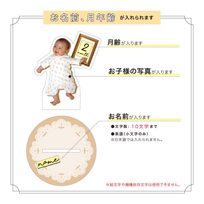 レースと淡い色味が優しいデザインで、お名前と月齢が入れられます。