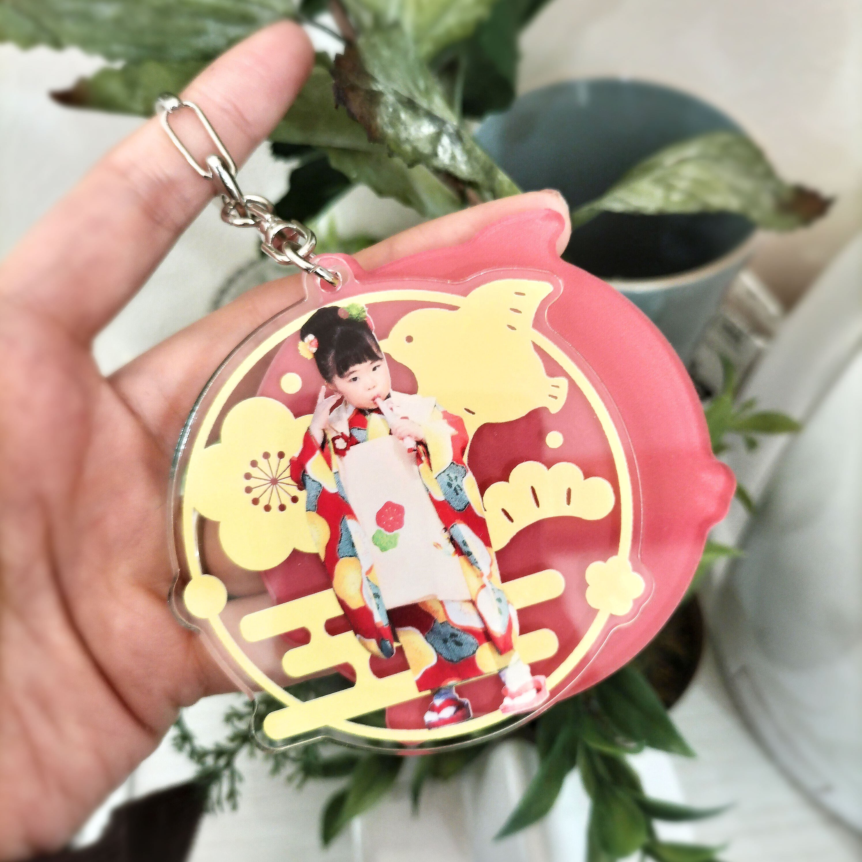 ✴︎「アクリルアート 七五三」と共通デザインとなっておりますが、アクリルアートとキーホルダーを作成の際、それぞれ別の機械を使用しているため、同じお写真をご使用になっても印刷の色味に違いが生じます。アクリルアートとキーホルダーを同じお写真、デザインで作成をご希望の方はその点のみ予めご了承くださいませ。